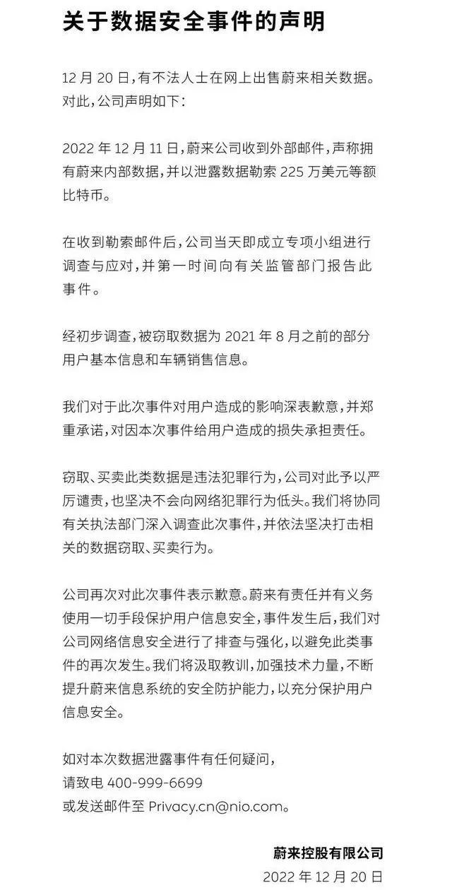 蔚来在声明中表示,2022年12月11日,蔚来公司收到外部邮件,声称拥有蔚来内部数据,并以泄露数据勒索225万美元(当前约1570.5万元人民币)等额比特币。