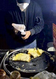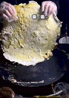 视频中这位据说摊饼资历长达七八年的摊主大哥,先是往锅里甩上厚厚一坨面糊。紧跟着拿出刷水泥的架势,把饼摊成薄厚不均的样子。单手打个支离破碎的鸡蛋后,他在滚烫中徒手给饼翻了个面。