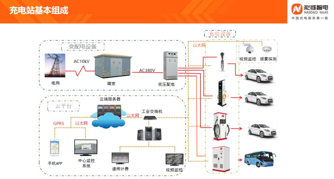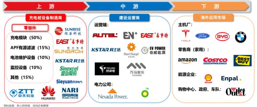充电桩产业链可以分为上游:零部件和充电设备,中游:建设运营商,下游:应用市场。