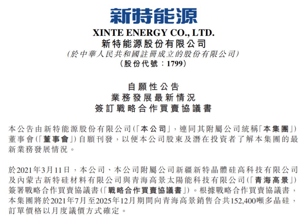 2021年3月,全资子公司青海高景太阳能与新特能源及其2家子公司签署《战略合作买卖协议书》,按照协议约定,分四年,新特能源向青海高景太阳能销售原生多晶硅15.24万吨,协议总金额约219.44亿元。