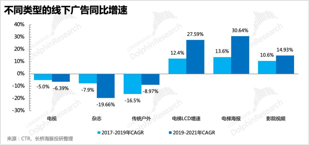 电视、杂志、传统户外广告,会继续面临流量迁移。但电梯、影院广告,则仍然会“用户必经”、“低干扰”等特征存在一定的壁垒。不过影院相比流量更稳定的电梯厂家来说,影院的流量会受到影片供给以及其他可替代的线下娱乐竞争影响,在影片淡季,广告曝光相对“低频”。