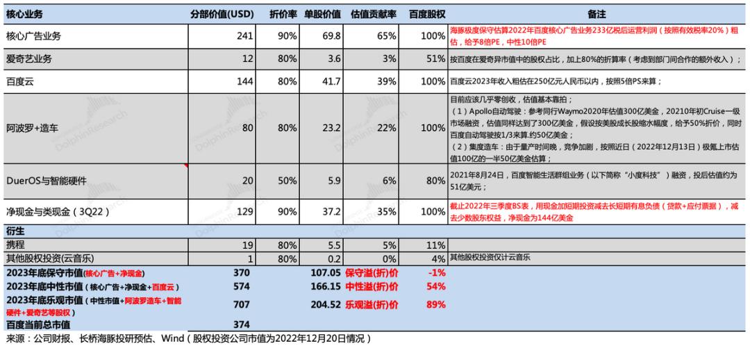 剔除2022年三季度末的净现金规模(=现金+短期投资-长短期有息负债-少数股东权益,并给予90%折价)129亿美金,剩下246亿美金。假设完全不考虑百度云、阿波罗及造车业务未来可能带来的增量价值,对应海豚君估算的2023年百度核心广告(不含爱奇艺)税后运营利润233亿元人民币,仅为7x PE,低于一般中性预期下的估值倍数10~12x。