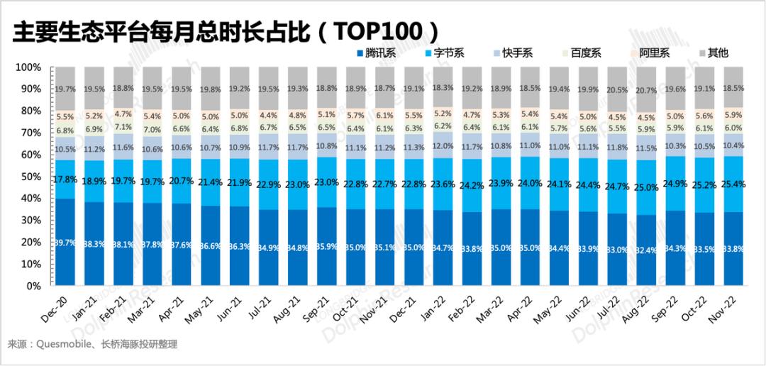 4)百度、阿里等其他巨头生态的总时长份额,这一年来基本保持稳态,以及无规律的小幅波动,源于还有自己的基本盘。