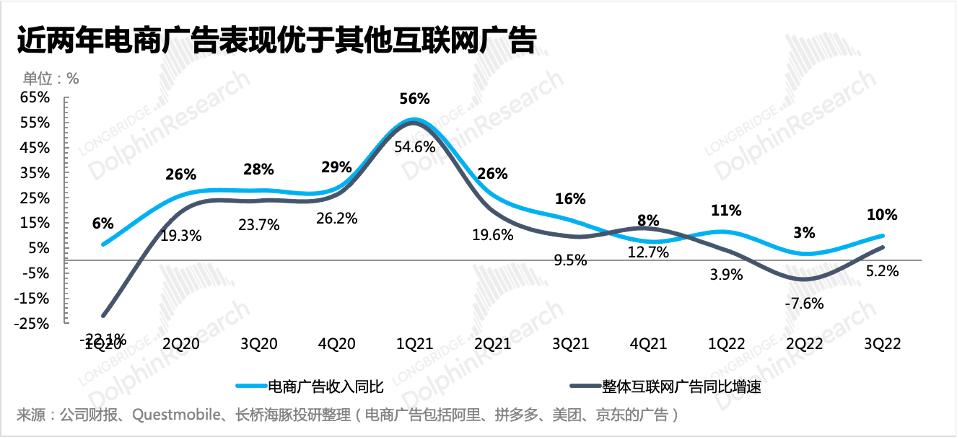 (2)而在经济高度不确定性的2022年,除了预算抠门而更依赖效果广告外,因为疫情反复各地不间断的封控,迫于清库存的压力,商家会自然地倾向于将广告投向离交易环节更近,更容易转化销售额的电商平台。因此在今年广告行业整体过于惨烈的情况下,电商平台的广告收入整体仍然保持了正增长。