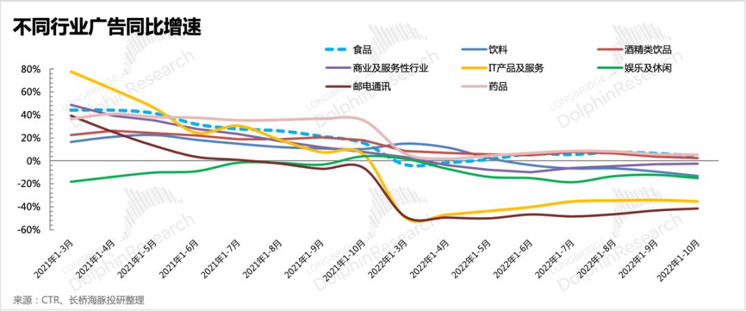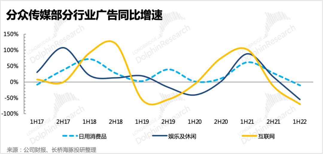 不过换个角度,站在当下的时点,海豚君也注意到,互联网及娱乐行业的广告增速也有接近触底的迹象: