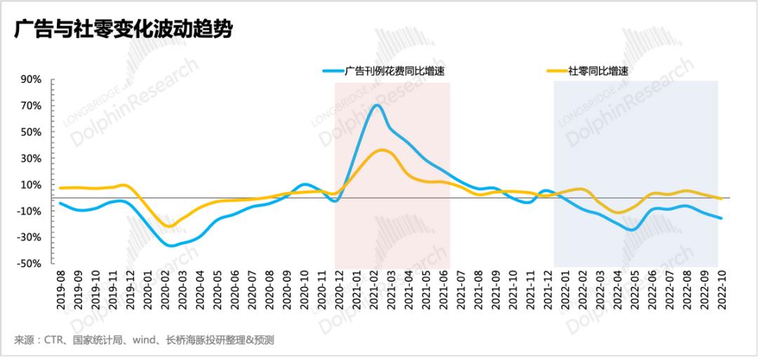 以近两年疫情下的情况为例,经济不确定性极 具 升高时,更能体现广告依附宏观但变动更敏感的特征:在4Q20、2Q22分别是早期疫情控制住后的复苏、一线城市大面积封控期,广告增速与社零增速的变动幅度均出现了较大差异。
