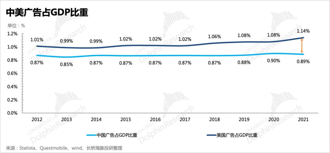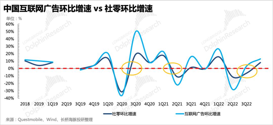 广告是宏观经济的晴雨表,商家的投放预算是基于未来一段时间的消费预期而制定。这也是在《至暗的广告:跌得太惨,不用估值常识就够》中,海豚君反复阐述的逻辑——广告的“里子”:从长期看,一个成熟的广告行业很难走出超GDP的增速,但短期在不同的经济周期拐点上,会出现“进攻”or“撤退”的抢跑。