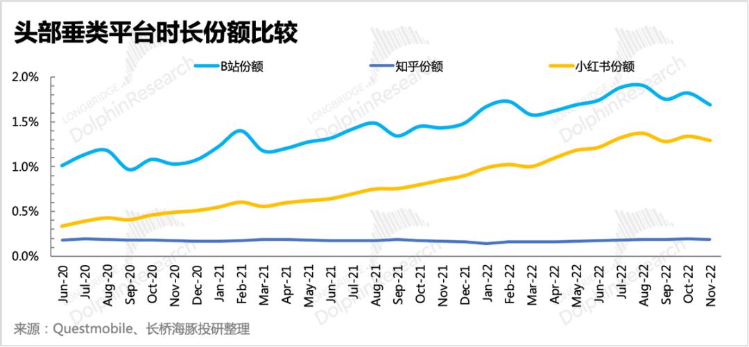 5)新兴垂类渠道中,B站、小红书的时长份额还在增长,知乎勉强回到往年巅峰,但天花板肉眼可见,破圈太难。