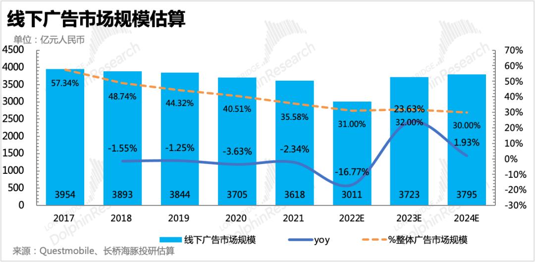 因此在度过感染高峰期之后,2023年线下广告的“超额”复苏是可以期待的,海豚君乐观预计,整体市场规模预计有望超过2020年的水平。