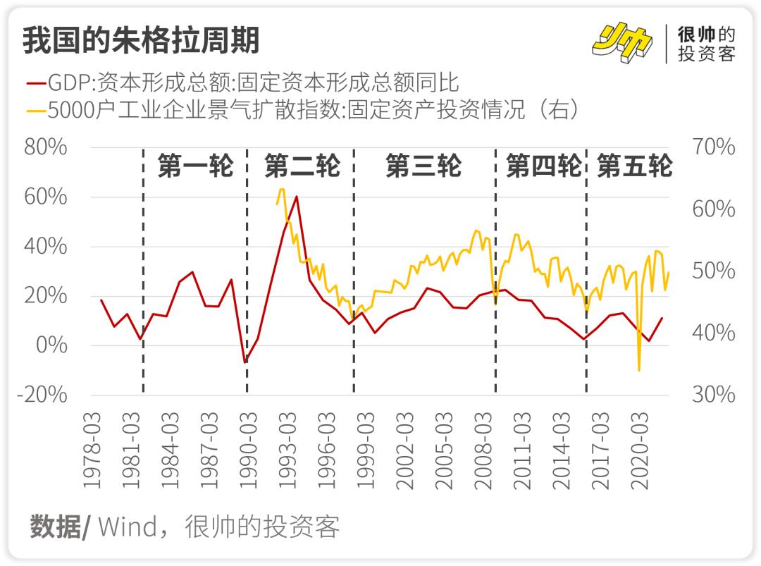 从改革开放到现在,我们一共经历了4轮完整的朱格拉周期,现在正在第5轮里前行。