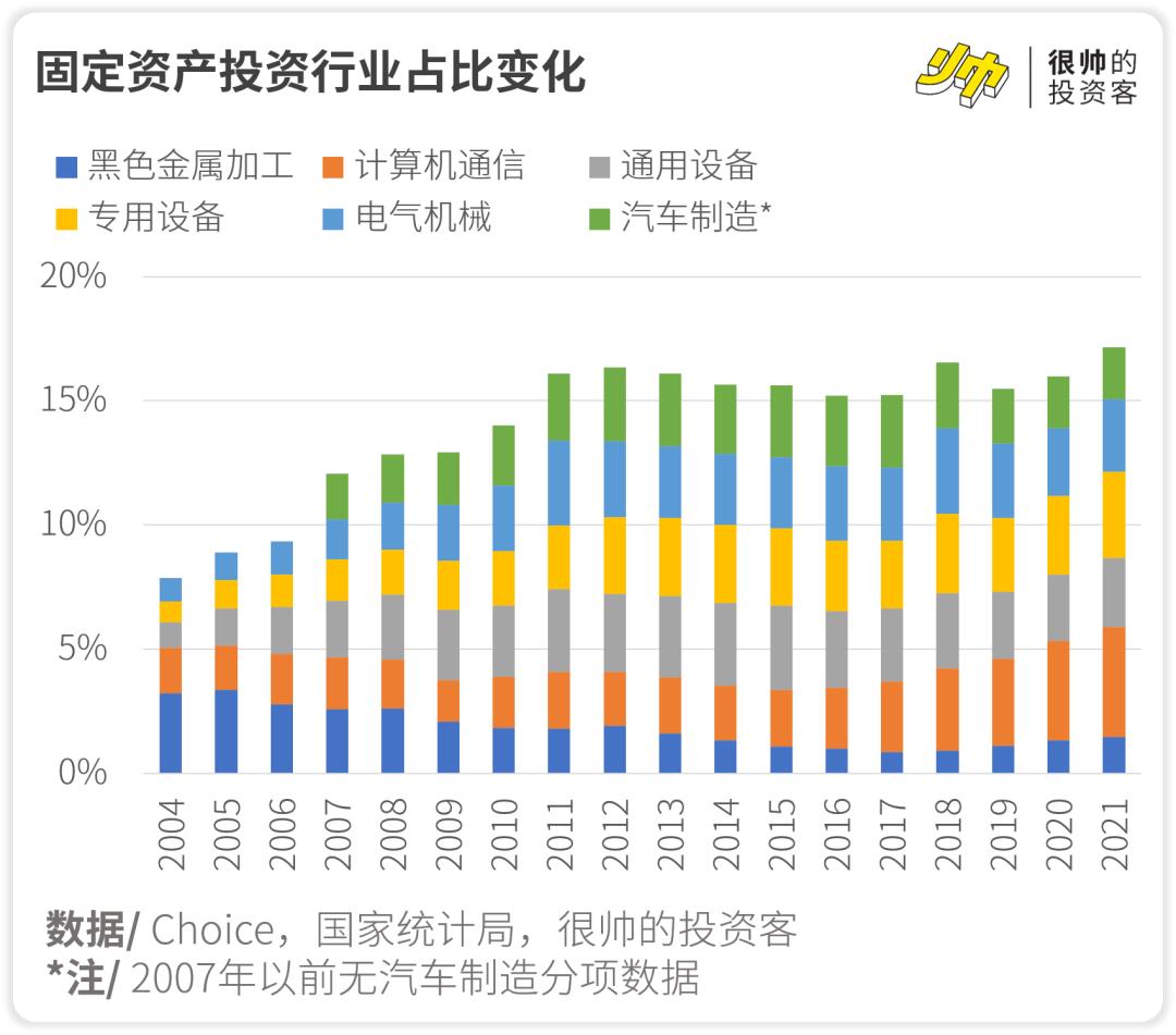 2009年之后,黑色金属加工业慢慢衰落,计算机通信、通用设备、专用设备、汽车和电气机械等的投资占比逐渐成长起来(2021年合计占比约16%)。