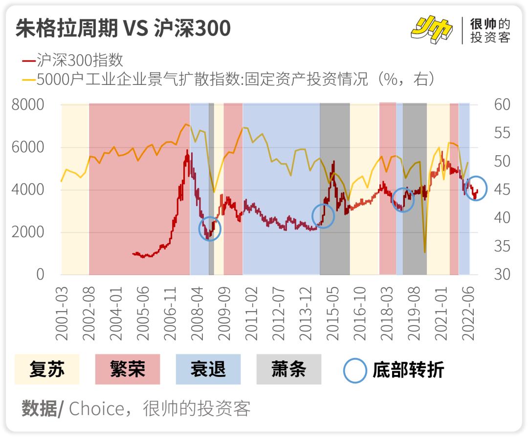 另外,沪深300指数的低点常常出现在朱格拉周期衰退期末端~萧条期的开端。