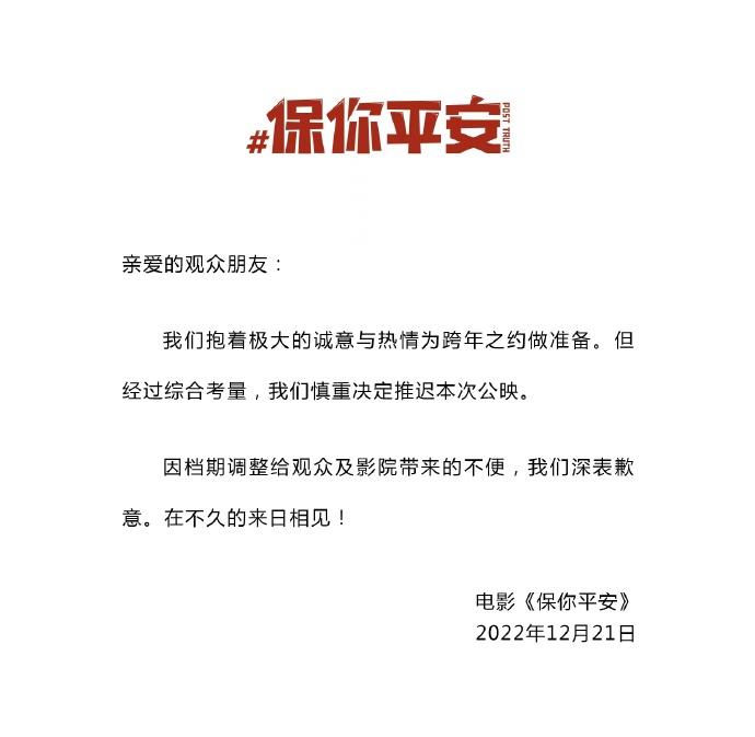 《保你平安》原本定档五一,因考虑疫情影响宣布撤档,后9月宣布定档跨年,之后宣发物料持续跟进,片中李雪琴、马丽、杨迪等喜剧明星路人缘不错,为影片积累了一定的观众基础,前不久《保你平安》宣布成为第四届海南岛国际电影节开幕电影,主创阵容亮相颇受关注,首映场媒体普遍给出较高评价,这也让《保你平安》关注度大幅提升,但《阿凡达2》票房表现不如预期,让《保你平安》对市场信心跌落,不得不选择再次推迟公映。