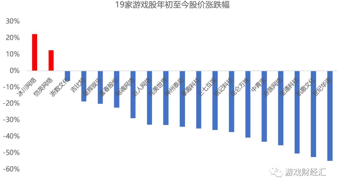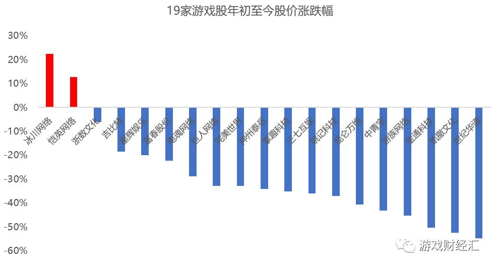 年初至今,19支游戏股只有2家(冰川网络、恺英网络)上涨,其余17家公司股价出现不同程度下滑,超过6成股价跌幅超过30%,曾经的A股游戏一哥世纪华通跌幅最大,跌幅超过50%。