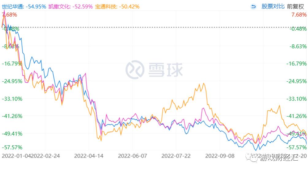 今年跌幅最大的三支游戏股:世纪华通、凯撒文化、宝通科技,三家公司年初至今跌幅均超过50%。三家公司股票从今年年初以来的走势如下: