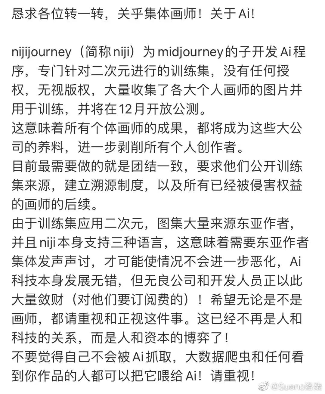 像Novel AI这样基于Stable Diffusion模型做微调的模型,它微调用的素材大多都是D站(日本的一个二次元网站)上的图片,D站上的很多二次元画师对此意见非常大。不久前,Midjourney的子程序nijijourney无视版权,大量收集个人画师们的图片用于训练模型的事情也在社交媒体上闹得沸沸扬扬。