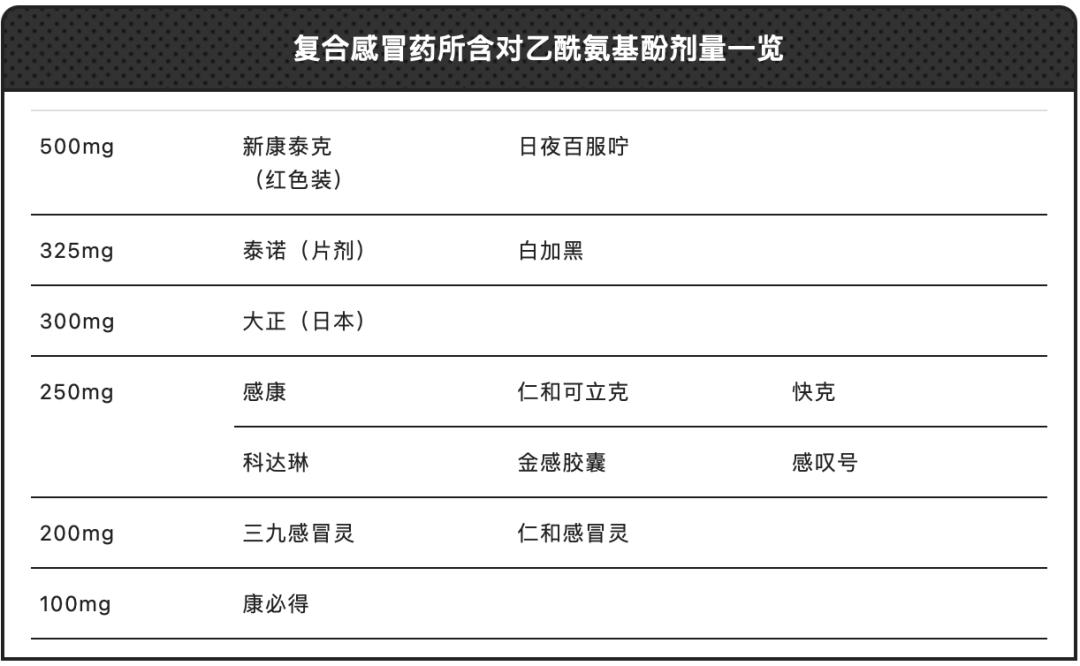 选复合感冒药同样要注意:不同品牌的感冒药里含有的对乙酰氨基酚剂量也不一样。就像前面说到的不同剂型,如果是发烧时用来退热止痛,大家要记得根据需要的剂量来用药,而不是直接照搬说明书。