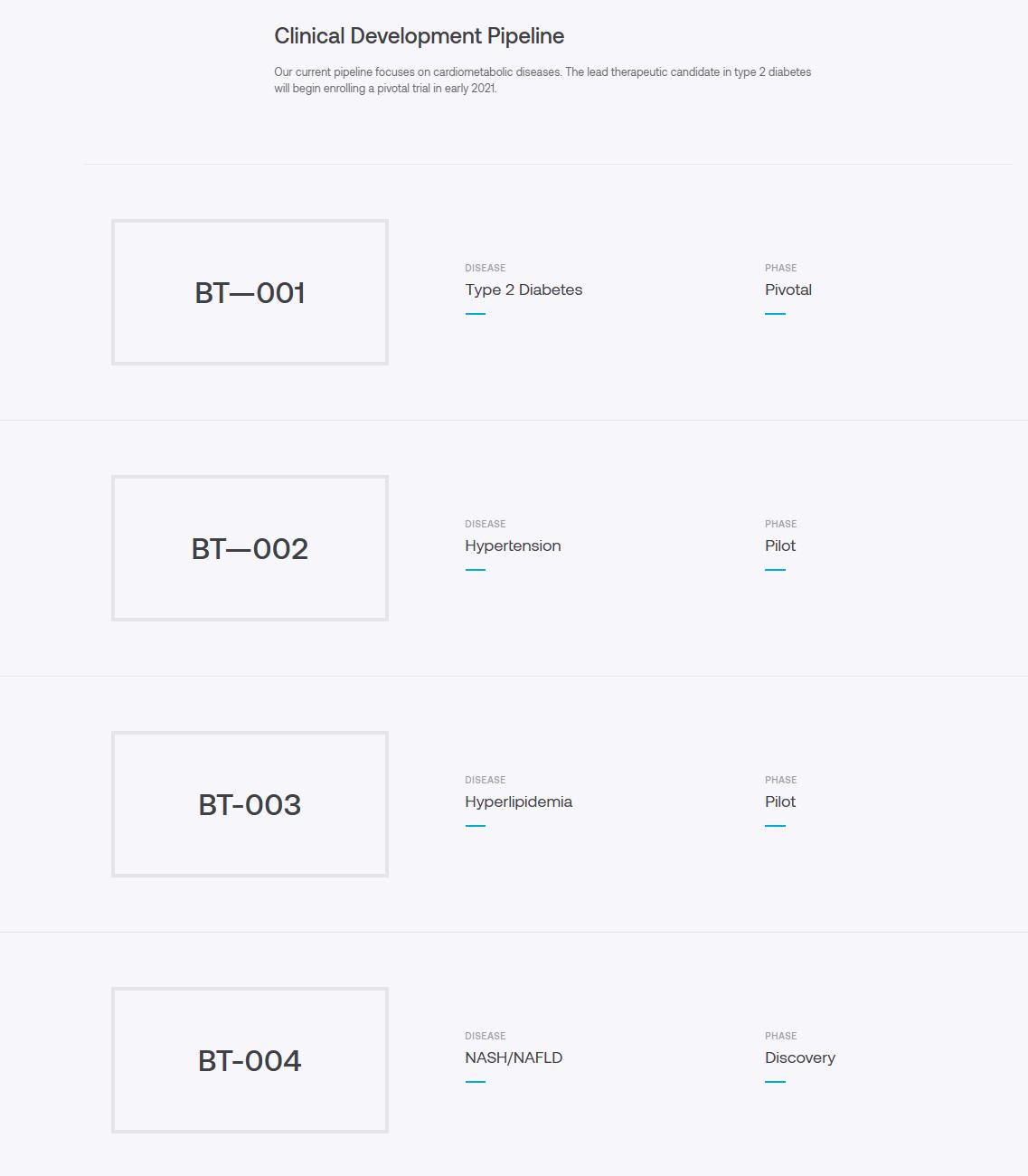 Better Therapeutics目前的产品线包括4款产品——针对治疗2型糖尿病的BT-001、针对高血压的BT-002、针对高脂血症的BT-003和针对非酒精性脂肪肝的BT-004。目前只有BT-001管线处于关键性临床阶段,BT-002和BT-003仍在试点研究阶段,BT-004处于发现阶段。