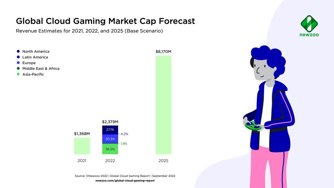 Newzoo称在2022年,云游戏服务吸引了超过3000万名付费用户,这些用户的总消费额预计将达到24亿美元。到2025年,全球云游戏市场的年收入有望增长至82亿美元。