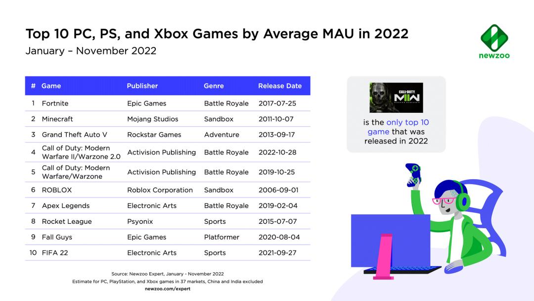 根据Newzoo的统计,在2022年月活跃用户数(MAU)排名前十的PC和主机游戏中,只有一款是今年发售的新作:《使命召唤:现代战争2》。除了《使命召唤:现代战争2》《糖豆人》《FIFA 22》之外,这份榜单内的另外7款游戏去年也进入了前十,而它们当中的大部分都属于在线服务型游戏。