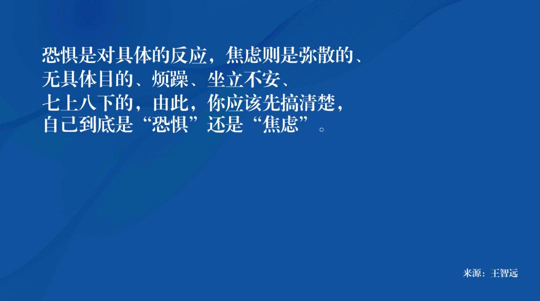 一般来说,恐惧是对具体的反应,焦虑则是弥散的、无具体目的的、烦躁的、坐立不安、七上八下的,由此,你应该先搞清楚,自己到底是“恐惧”还是“焦虑”。