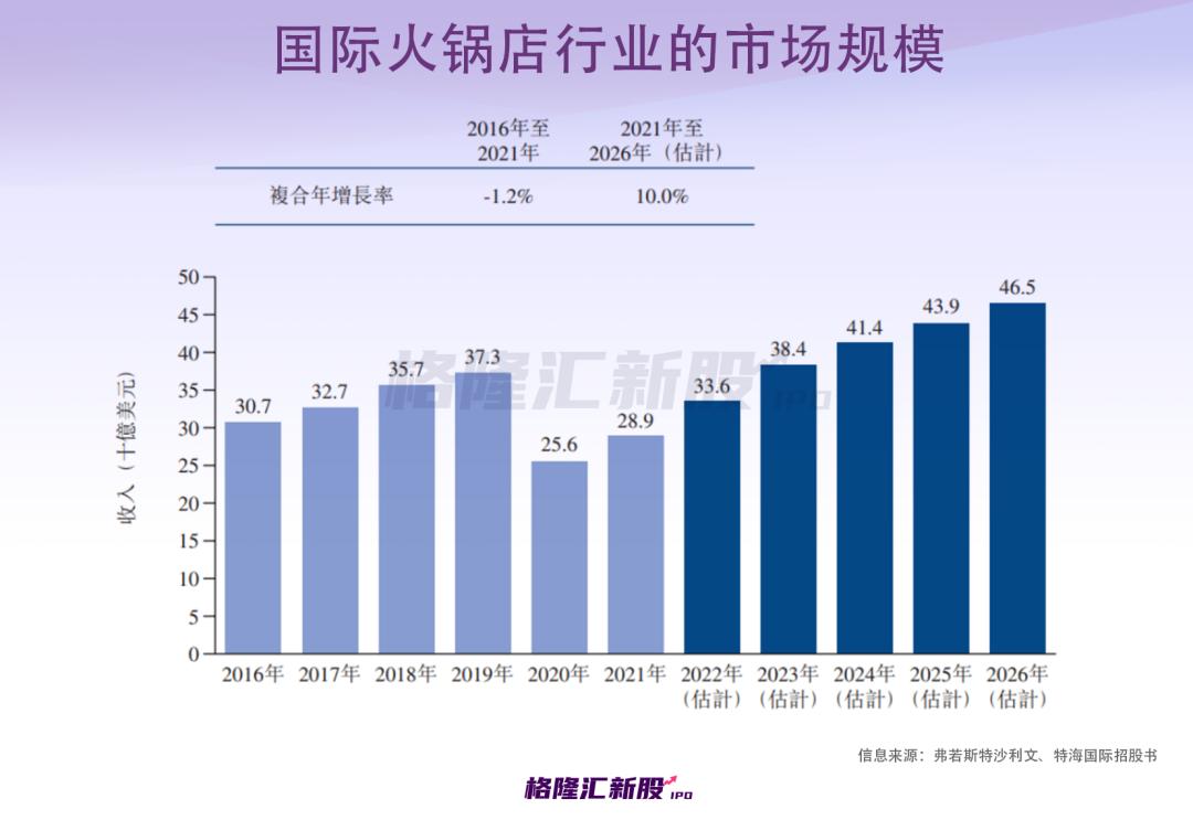据弗若斯特沙利文数据,2019年国际市场上火锅店的市场规模高达373亿美元,受疫情影响,2021年降至289亿美元。但随着火锅店数量越来越多,火锅店在国际市场的规模还将继续增长,预计2026年将达到465亿美元,2021年至2026年的复合年增长率为10%。