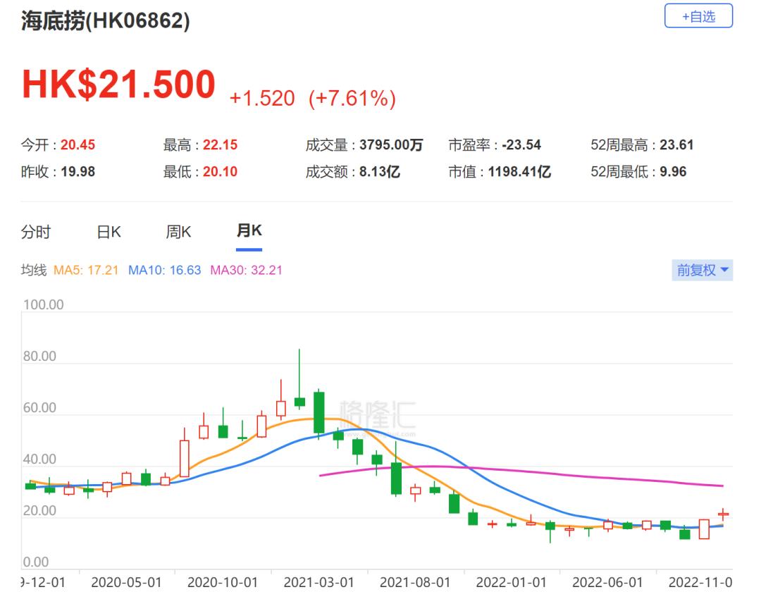 截止12月22日下午收盘,呷哺呷哺涨超15%,海底捞、九毛九均涨超6%。近两个月,港股头部餐饮品牌股票纷纷翻红,海底捞、大家乐集团等均有30%以上的反弹,呷哺呷哺更是涨超70%。
