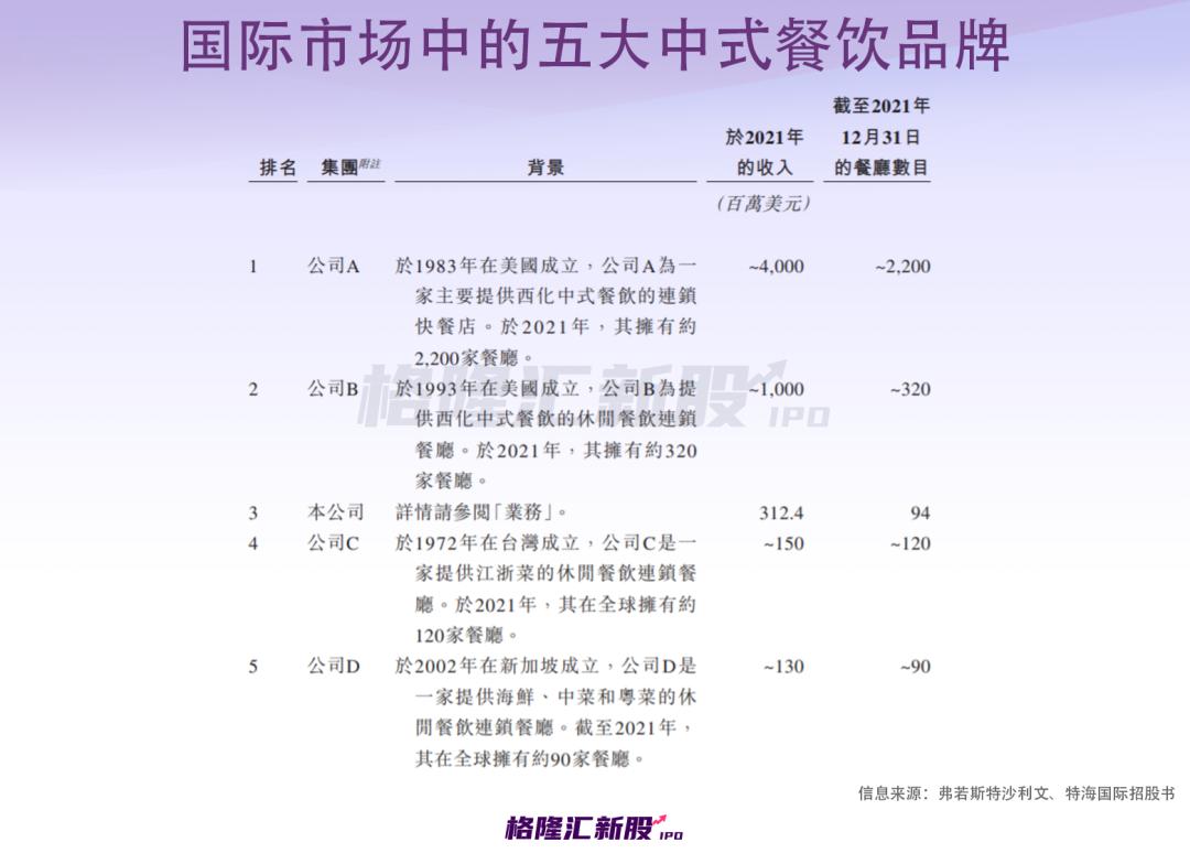 特海国际主要在国际市场提供海底捞火锅,2021年,其以3.12亿美元的收入,成为国际市场第三大中式餐饮品牌,前两大是总部位于美国的Panda Restaurant Group及PF Chang’s China Bistro。
