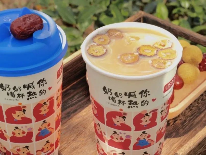 首先,姜汤产品有利于排汗,百分茶最近推出了 “姜枣桂三冬暖” ,融合生姜汁、燕麦奶、桂圆红枣等原料。
