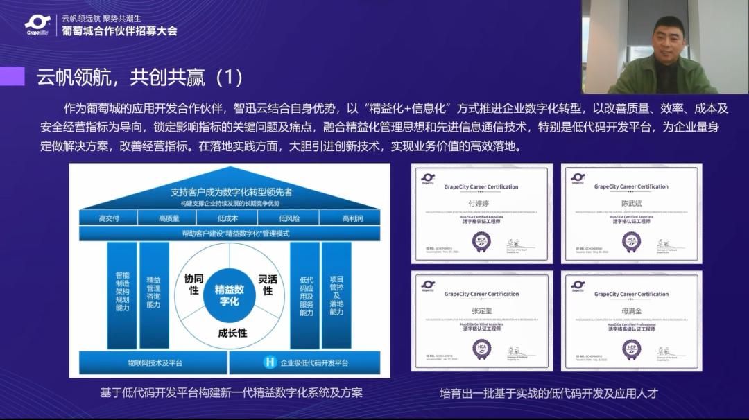 来自重庆智迅云的杨兵燕总经理也介绍了公司与葡萄城的故事。作为一家以精益管理咨询与信息化定制融合方式、帮助企业切实提升经营绩效的同时构建数字化时代的核心竞争能力的软件公司,智迅云十分注重应用系统的高适性和柔性化。作为葡萄城的应用开发合作伙伴,智迅云结合自身优势,以“精益化+信息化”方式推进企业数字化转型。2017年,智迅云开始应用“低代码”技术并于2021年全面使用葡萄城企业级低代码平台“活字格”服务于制造业客户的精益数字化转型,目前已实施落地60余家,其中包含洽洽食品、桂州洁伶等国内知名企业,并且取得了显著的效果。目前,智迅云已形成了大量成熟标准化的低代码应用模块,构建了覆盖制造企业全业务的“智迅云•精益数字化管理系统”,并培育出一批基于实战的低代码开发及应用人才。此外,智迅云也与葡萄城展开了全方位、多维度、深层次的合作,如行业研讨会、行业解决方案共建等,实现产品及品牌的共创共赢。