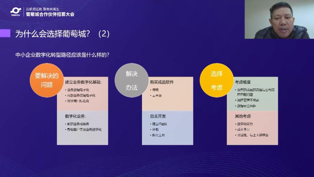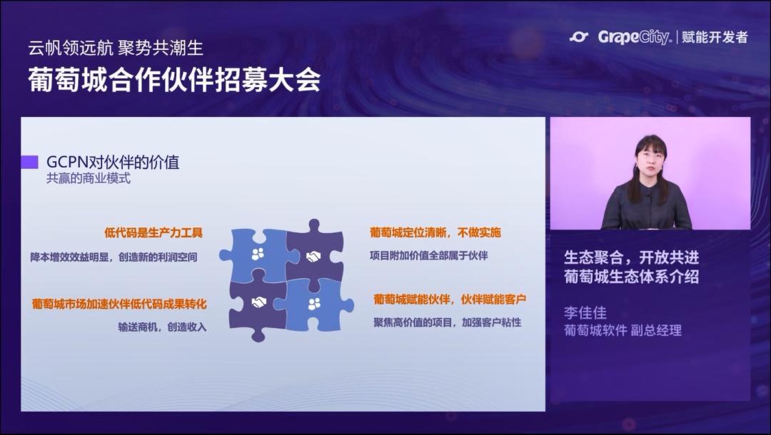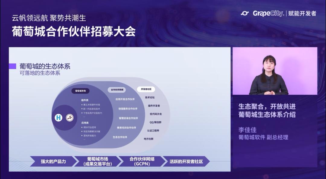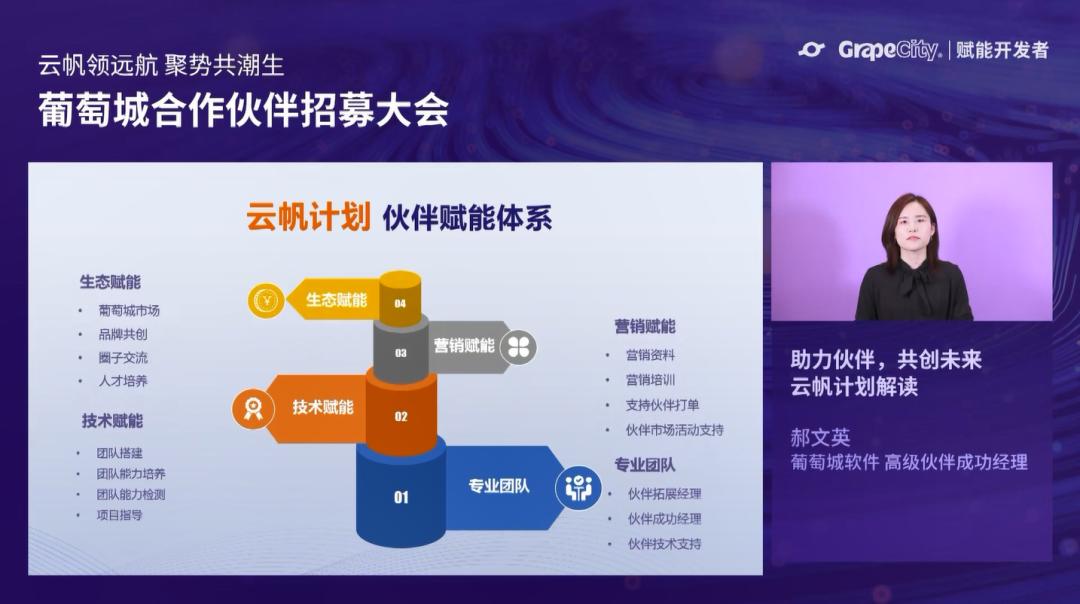 葡萄城秉承“先伙伴投入而投入,后伙伴成功而成功”的合作理念,面向所有合作伙伴推出整套赋能体系——云帆计划。这是合作伙伴网络中的重要一环,涵盖技术、营销、生态等多方面,以产品的最佳实践、行业的成功经验为伙伴赋能。葡萄城软件高级伙伴成功经理郝文英详细介绍了云帆计划的详细内容:从团队搭建、团队能力培养、能力检测与认证、项目指导,到成果转化、商机输送、品牌共创,在伙伴成功之路上的每个环节上,葡萄城都有专业团队都为伙伴成功保驾护航。