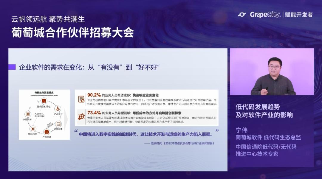 在本次会议中,葡萄城软件低代码生态总监、中国信通院低代码/无代码推进中心技术专家宁伟首先分享了低代码技术发展趋势及其与软件行业的融合。他介绍到,在数字实践的加速时代,用户对快速开发、柔性生产、敏捷管理的应用开发方式也产生了强烈需求。低代码作为软件开发技术的集大成者,通过帮助客户解决“技术复杂度”来提升软件开发生产力和生产效率。而葡萄城的6年实践证明,低代码在高价值系统开发领域具有广阔的应用前景。