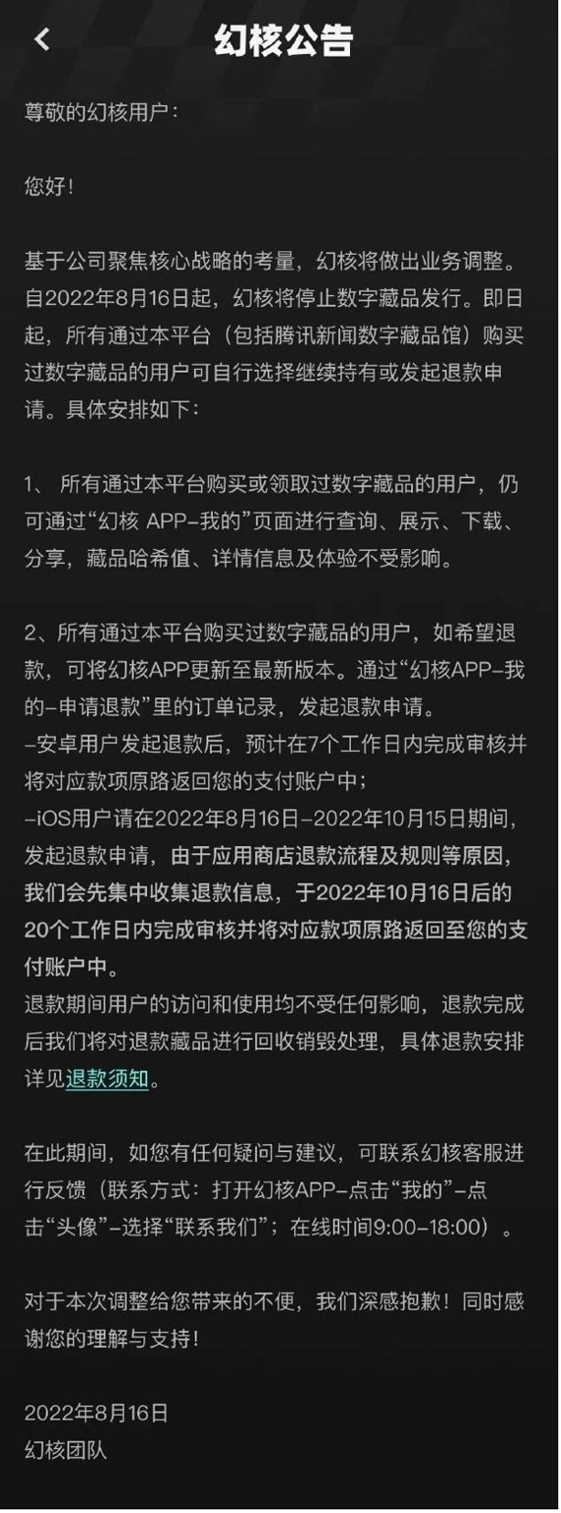 8月16日,曾经国内最大的数藏平台幻核正式宣布停售数字藏品,这个背靠腾讯,坐拥众多IP,不缺资金支持的数藏平台,上线不到一年便宣布关停。