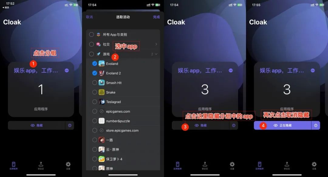启动 Cloak 后,我们可以在 Cloak 中根据实际需要建立多个分组,将不同场景下需要隐藏的应用分组收纳。根据分组勾选想要隐藏的应用,然后点击下放的隐藏按钮即可完成隐藏。