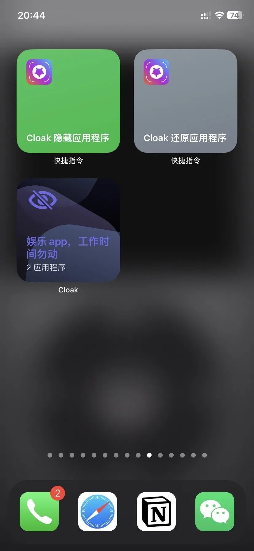 Cloak 提供了隐藏和取消隐藏两个快捷指令动作,同时也提供了一个用于切换开关状态的小组件。把小组件放在桌面上,需要的时候便可以一键隐藏 / 显示桌面 app 了。对了,如果你用的是快捷指令,还可以借助 iOS「轻点背面」功能来触发。