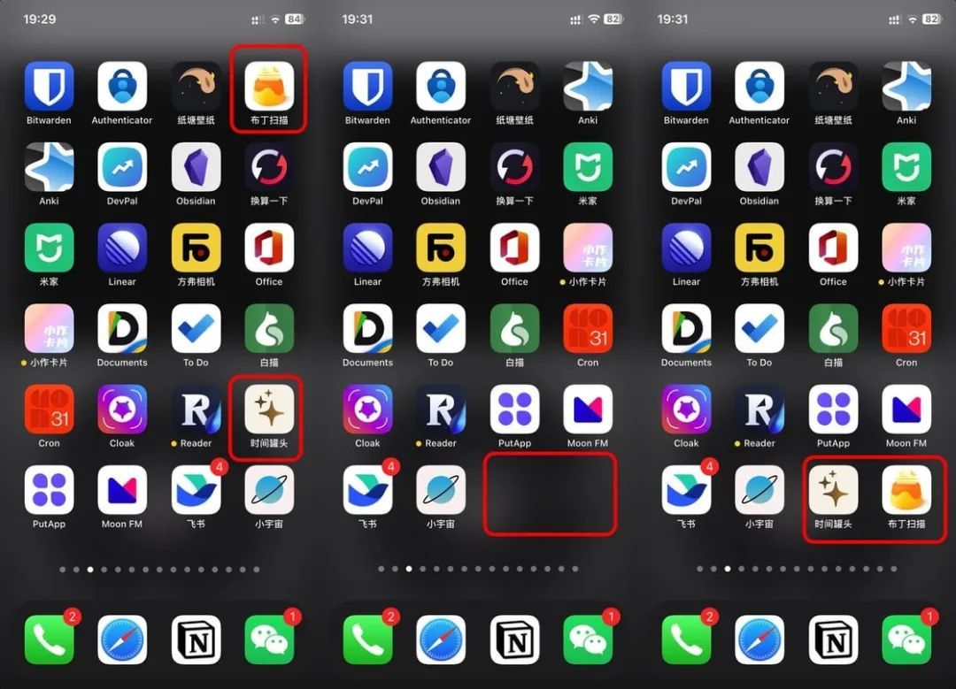 正如下方图片中显示的那样,隐藏第一行第四个和第五行第四个应用,此位置不会留空而是被后面的图标补齐,空缺被移到了最后,所以在恢复 app 时候图标就会补充到最后这个空白处。这里建议把要隐藏的 app 放到一屏的末尾,就不会有这个问题了(奇怪的解决方式 +1)。