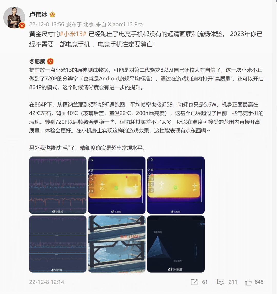 事实上,卢伟冰不是最近这几天才断言电竞手机的「死局」,本月初就指出小米13在《原神》上已经跑出电竞手机都没有的超清画质和流畅体验,并给出自己的判断:「2023年你已不需要一部电竞手机,电竞手机注定要消亡!」
