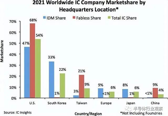 当日本半导体企业从全球市场败退,美国、韩国以及来自中国台湾的企业开始逐渐成为主角。到了2021年,日本在全球半导体市场的份额仅为6%,同期的美国和韩国市场份额则分别为54%和22%。