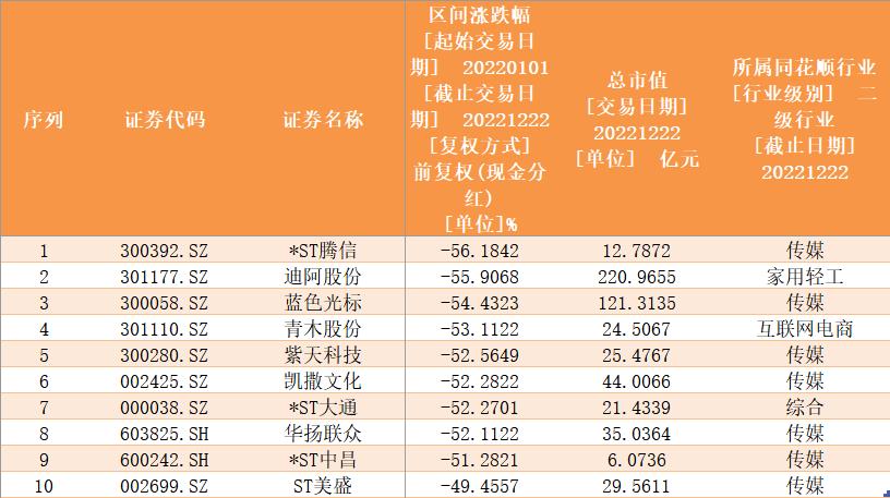 在所有股价下跌的抖音概念股中,年初至今跌幅超过30%的公司达37家,跌幅最大的10家公司则平均跌幅超过50%。