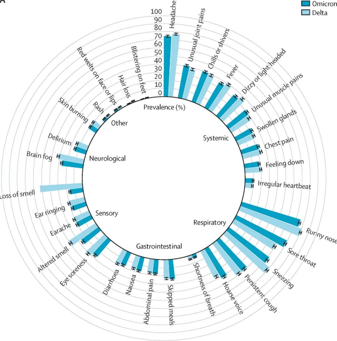 在2022年6月的一篇文章中,伦敦国王学院的研究者首次提到了奥密克戎产生的long Covid症状[4],研究发现,奥密克戎发生long Covid的几率似乎要比德尔塔低,而且和疫苗接种的情况也有关系。