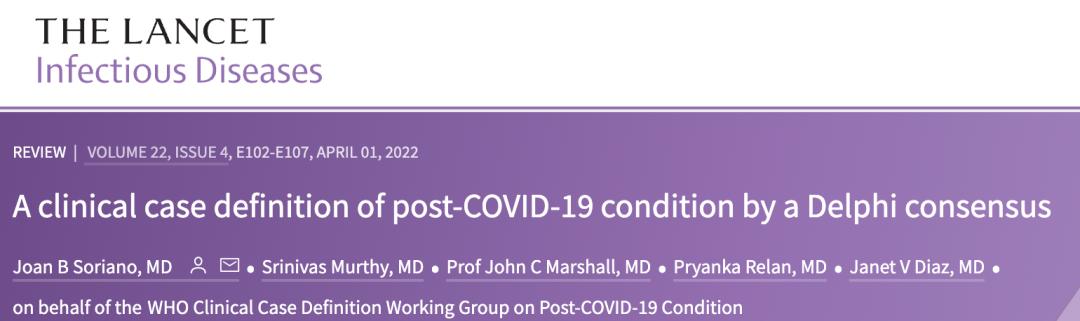 2021年10月,世界卫生组织(WHO)在《柳叶刀 传染病》杂志上建立了定义:long Covid(也叫做长期新冠,新冠后症状)。[1]用来解释感染新冠后3个月内出现的症状,这些症状也许持续两个月之久,而且没法用其他的病症来解释。