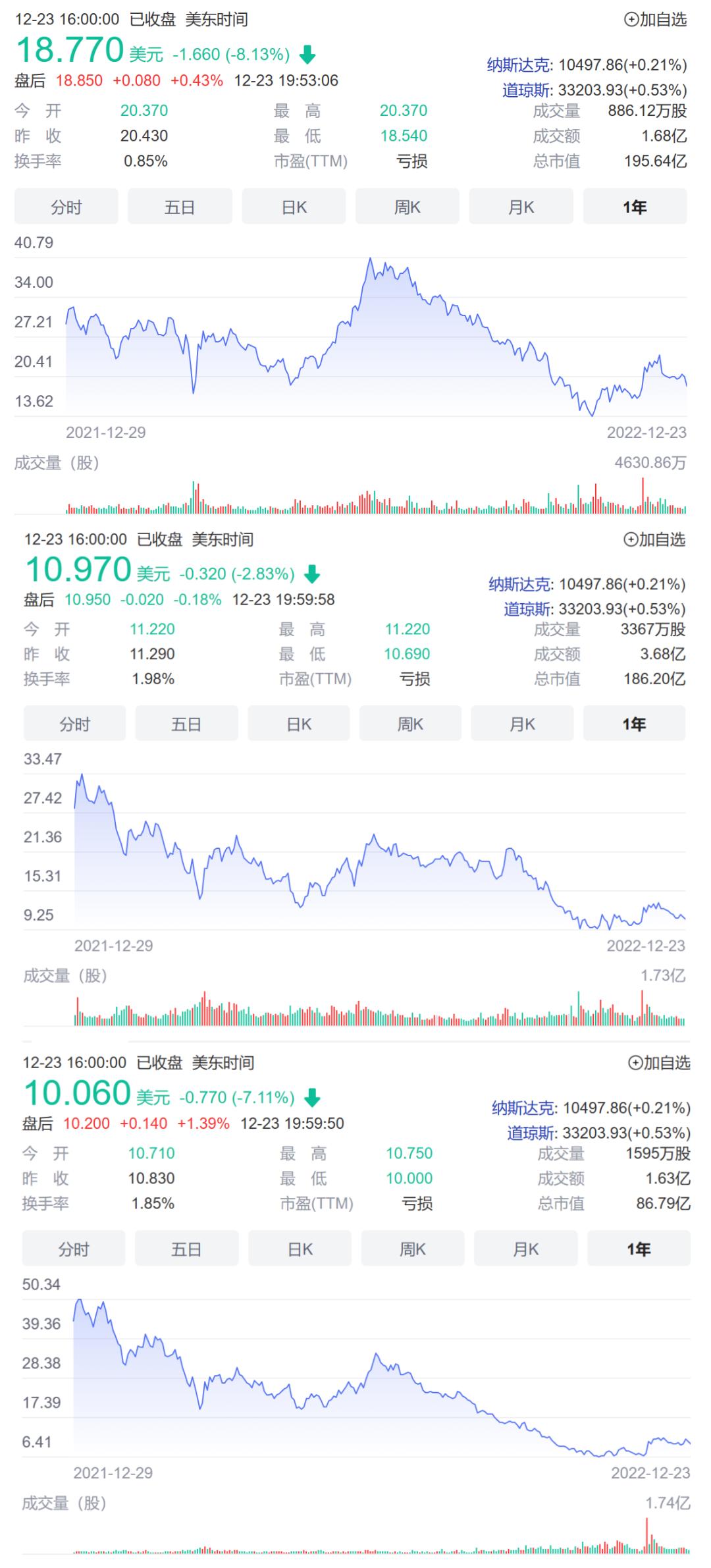 『自上而下分别为:理想、蔚来、小鹏一年来美股股价走势』