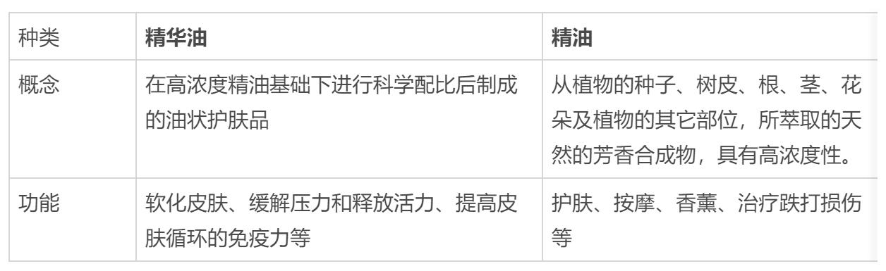 传统精华以水剂精华为主,属于化学提取物,含有微量元素以及胶原蛋白、透明质酸等人类肌肤所需物质,具有蒸发快的特点。而精油是从植物的种子、树皮、根、茎、花朵等部位所萃取的天然的芳香合成物,具有高浓度性,需要经过稀释后才能用到皮肤上。
