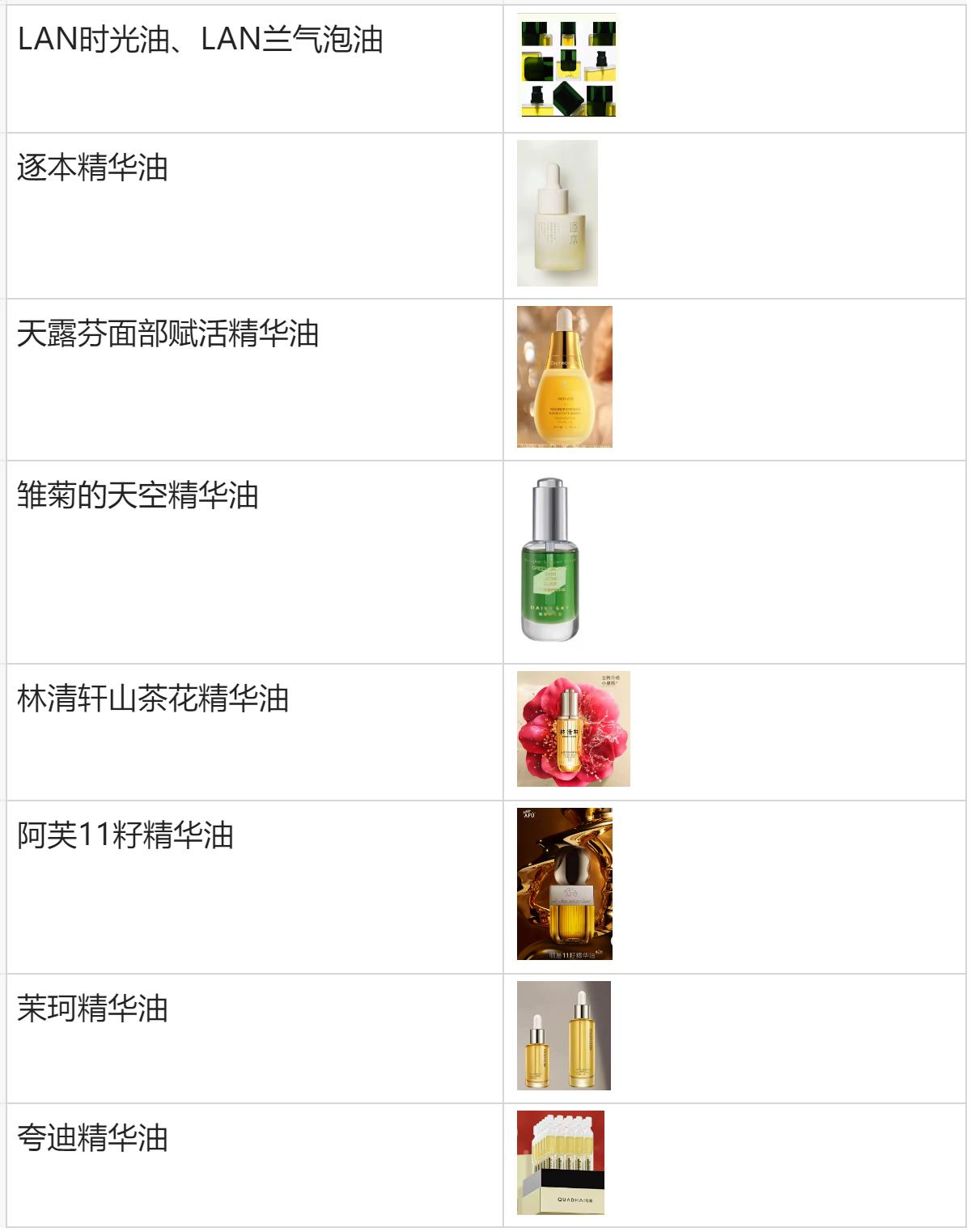 LAN蘭时光精华油、天露芬精华油、雏菊的天空翡冷翠精华油、林清轩山茶花精华油、夸迪悬油精华油曾入选至李佳琦直播间,其中天露芬精华油第一次在李佳琦直播间亮相,在三分钟内把销量冲到5000多瓶,后续又在三个月内连续三次进入李佳琦直播间,成为现象级爆品。
