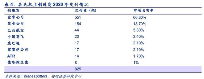 各民用机主制造商2020年的交付情况 资料来源:planespotters,安信证券研究中心