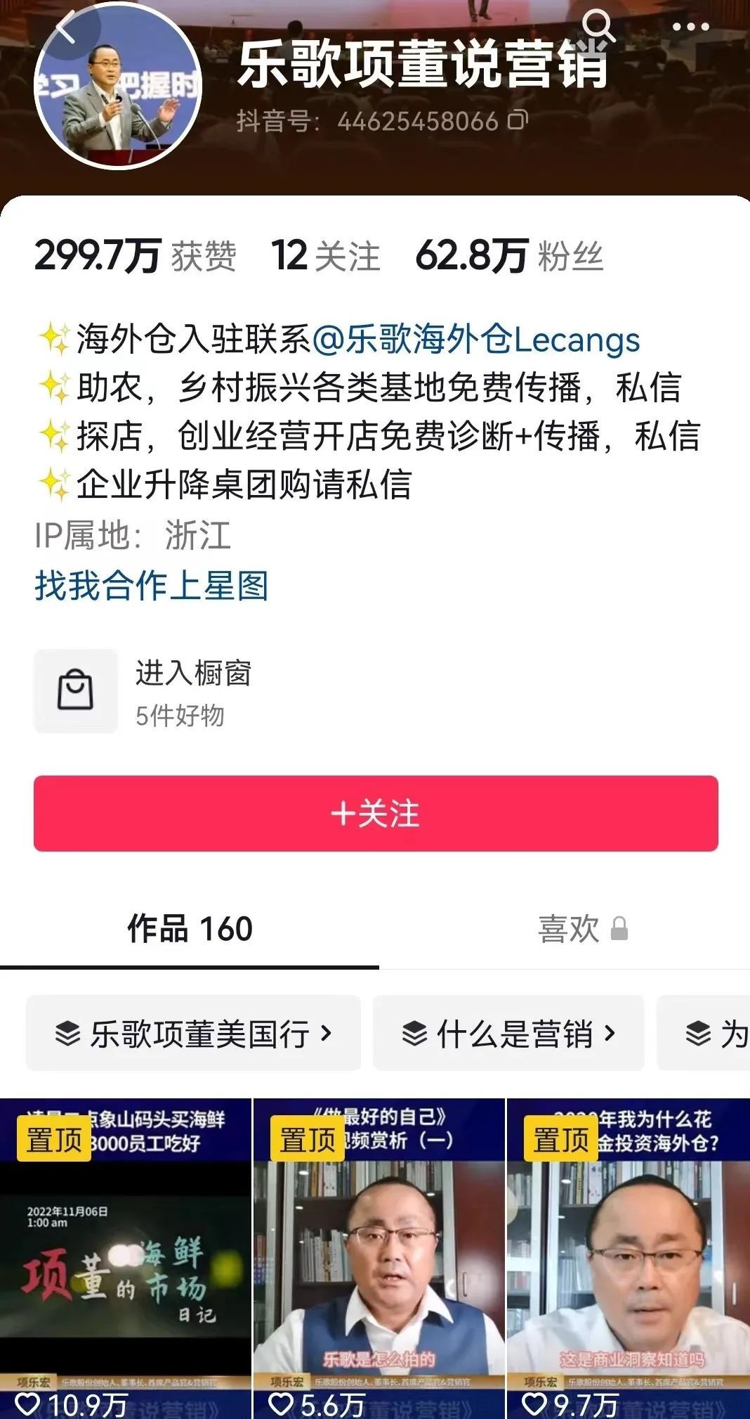 比如说项乐宏的个人抖音号“乐歌项董说营销”,目前粉丝62.8万。置顶视频《项董的海鲜市场日记》播放量上百万、点赞量超10万,展示了项乐宏为了员工能吃到新鲜海鲜,凌晨2点亲自去象山海鲜市场进货等内容。