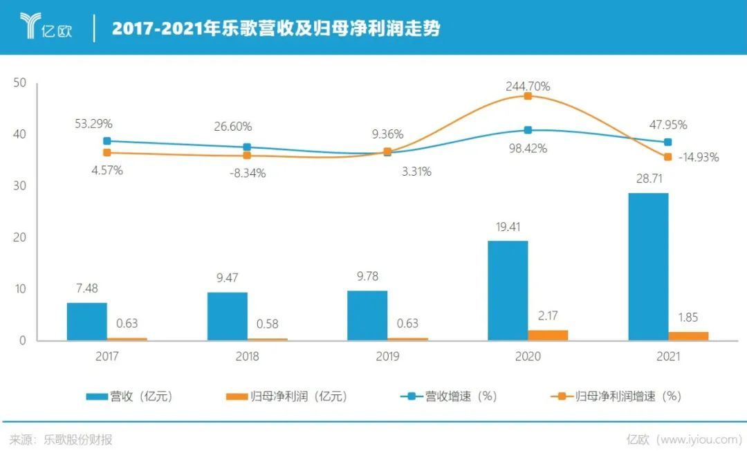 财报显示,2021年,乐歌全年营业收入为28.71亿元,同比增长了47.95%;归母净利润为1.85亿元,同比下降了14.93%。截至12月23日收盘,乐歌股价为16.31元,最新市值39.01亿元。