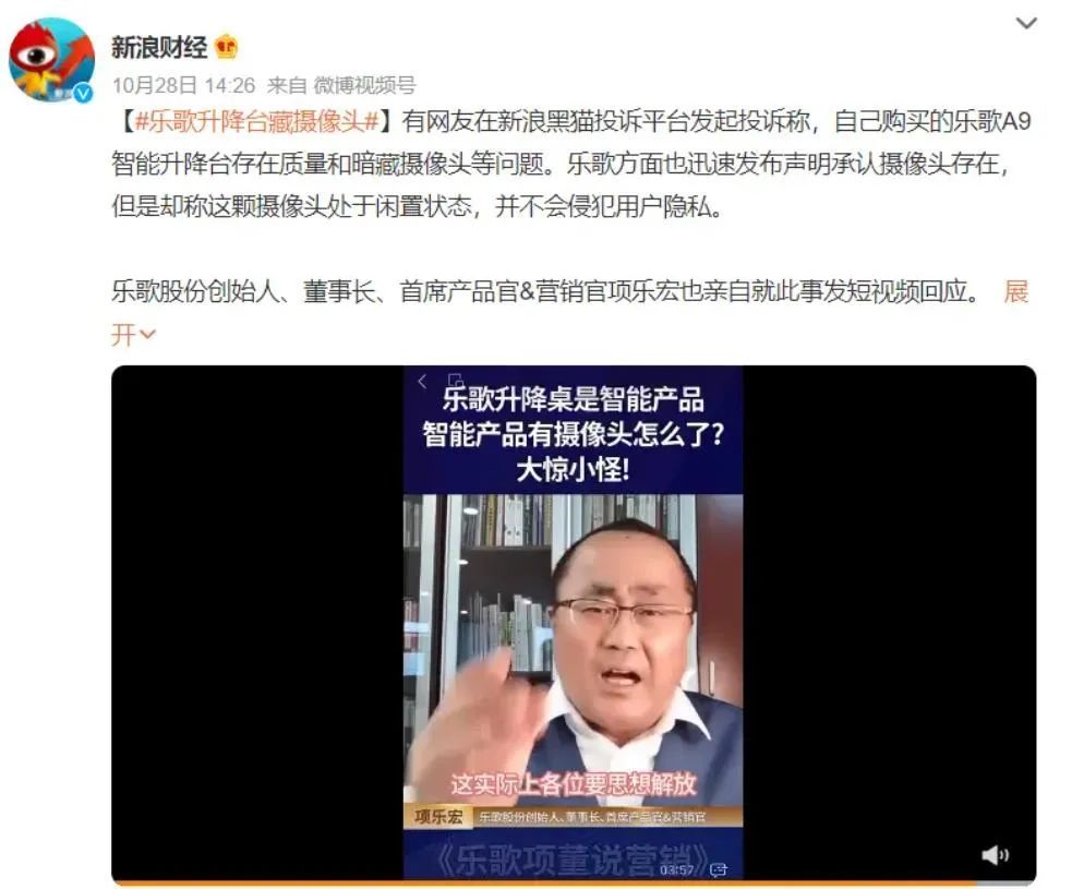 今年9月底,乐歌因“摄像头门”事件被质疑侵犯消费者隐私。起因是有消费者在“黑猫”上投诉称,自己购买的乐歌A9智能升降台存在质量和暗藏摄像头问题,经媒体报道后,这一新闻迅速在网上发酵并引发大量关注。