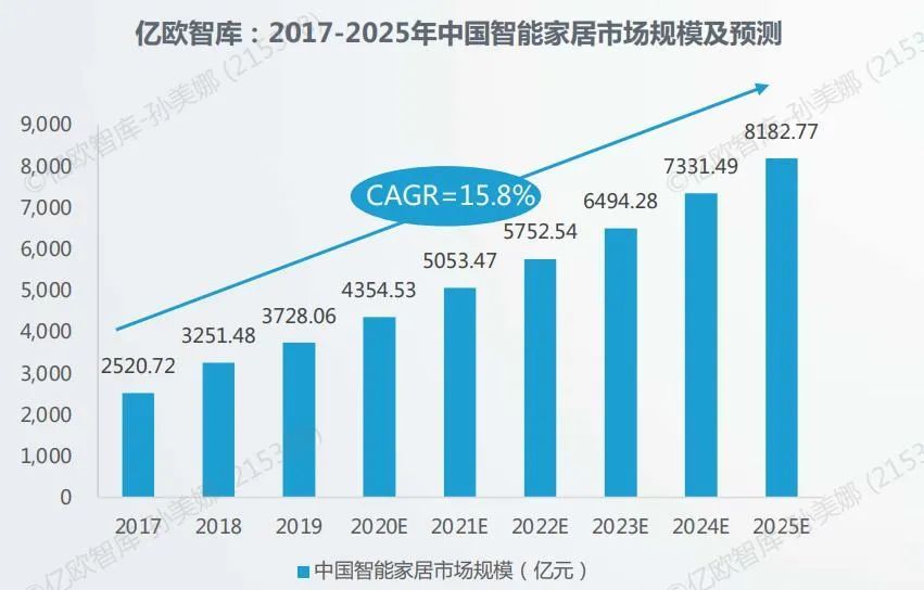 仅从下游的智能家居这一个应用场景看,就有相当庞大的市场。亿欧智库曾在《2020中国智能家居行业研究报告》中预计,2025年中国智能家居市场规模有望突破8000亿元,2017-2025年复合年均增长率约为15.86%。
