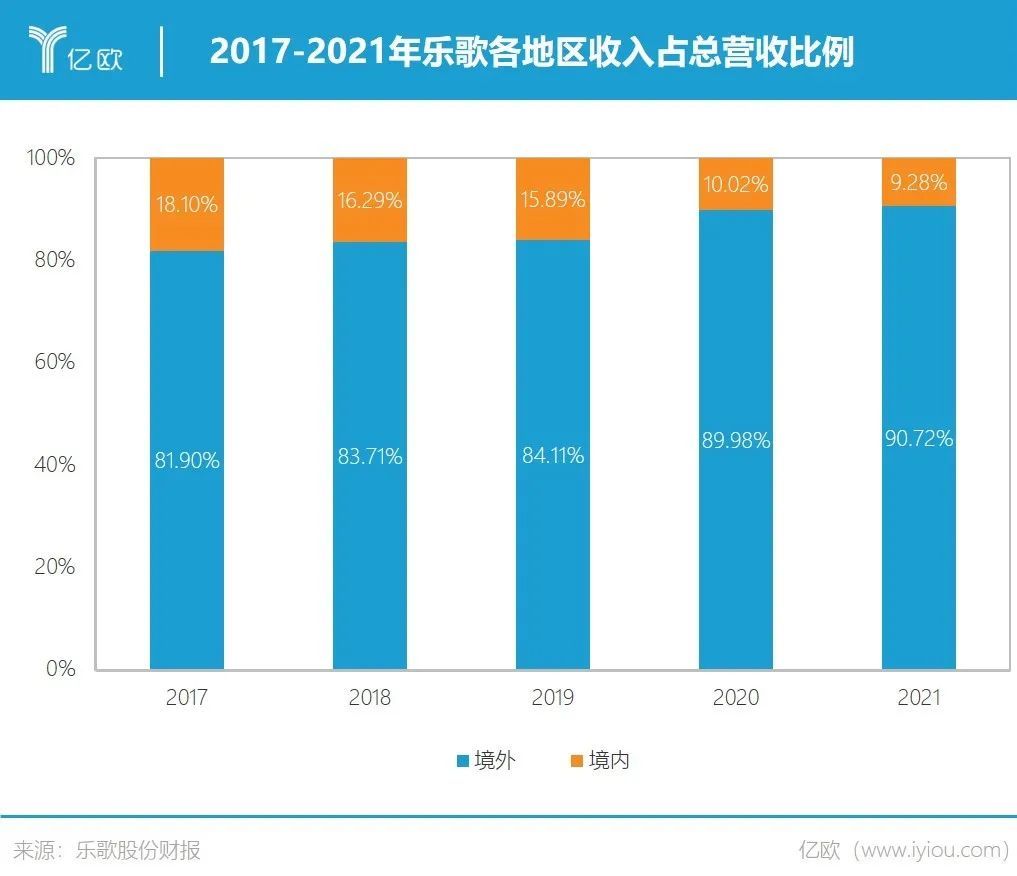 因为发力海外更早、转型较为成功,再加上重视海外仓和独立站建设,乐歌在亚马逊等跨境电商平台升降桌品类销量排名中长期位居第一。2021年,乐歌境外地区营收26.05亿元,占总营收比重的90.72%。